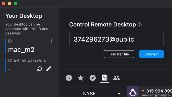 Programa Rustdesk ejecutándose que aparecerá en tu pantalla. Observa la ID y la contraseña que se muestran en el lado izquierdo. Son los datos que debes indicar al técnico que conecta.